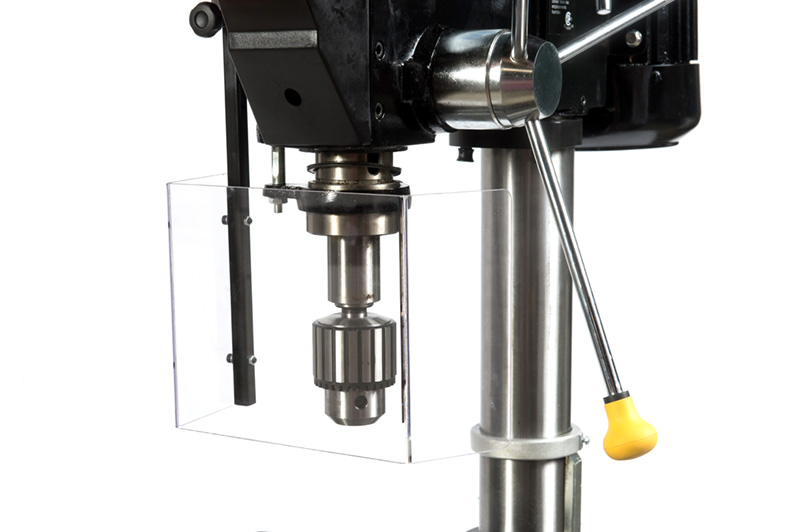 A very special feature on the DP500 is an excellent swing away chuck guard that utilizes an electrical interlock to shut down the machine. If the large see through guard is not in place while changing drill bits the machine cannot be started or if it is swung out of the way while in use the machine will instantly shut down.